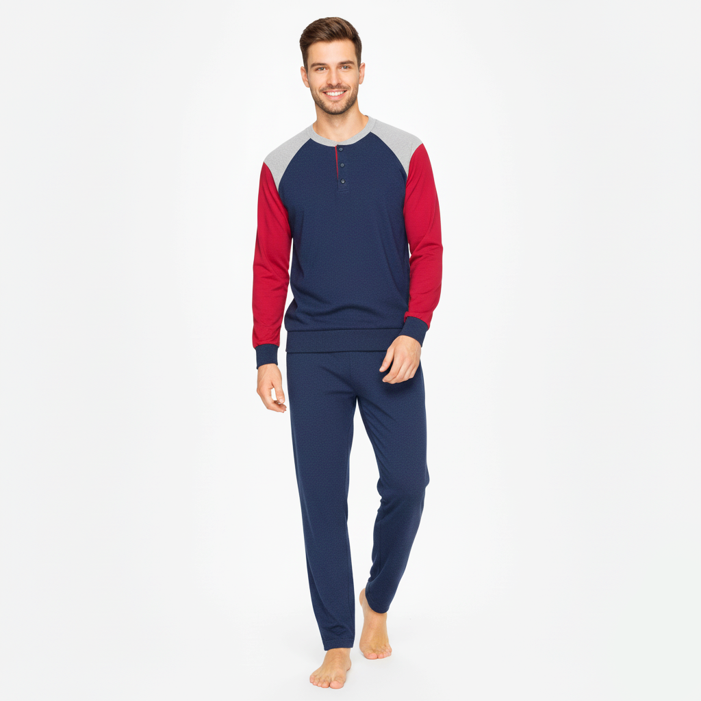 Pigiama da uomo in jersey color petrolio con profili blu e abbottonatura a 3 bottoni. Pantalone lungo blu.