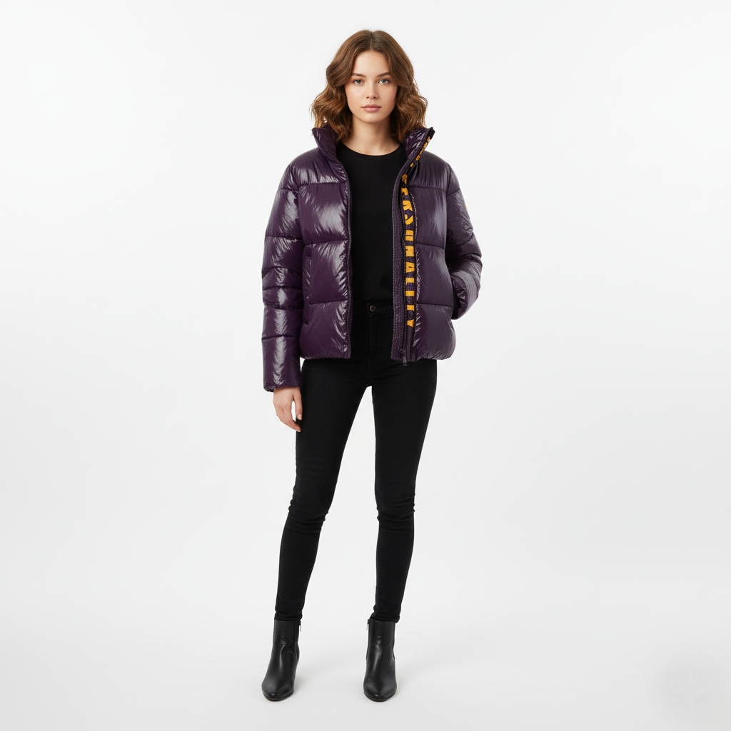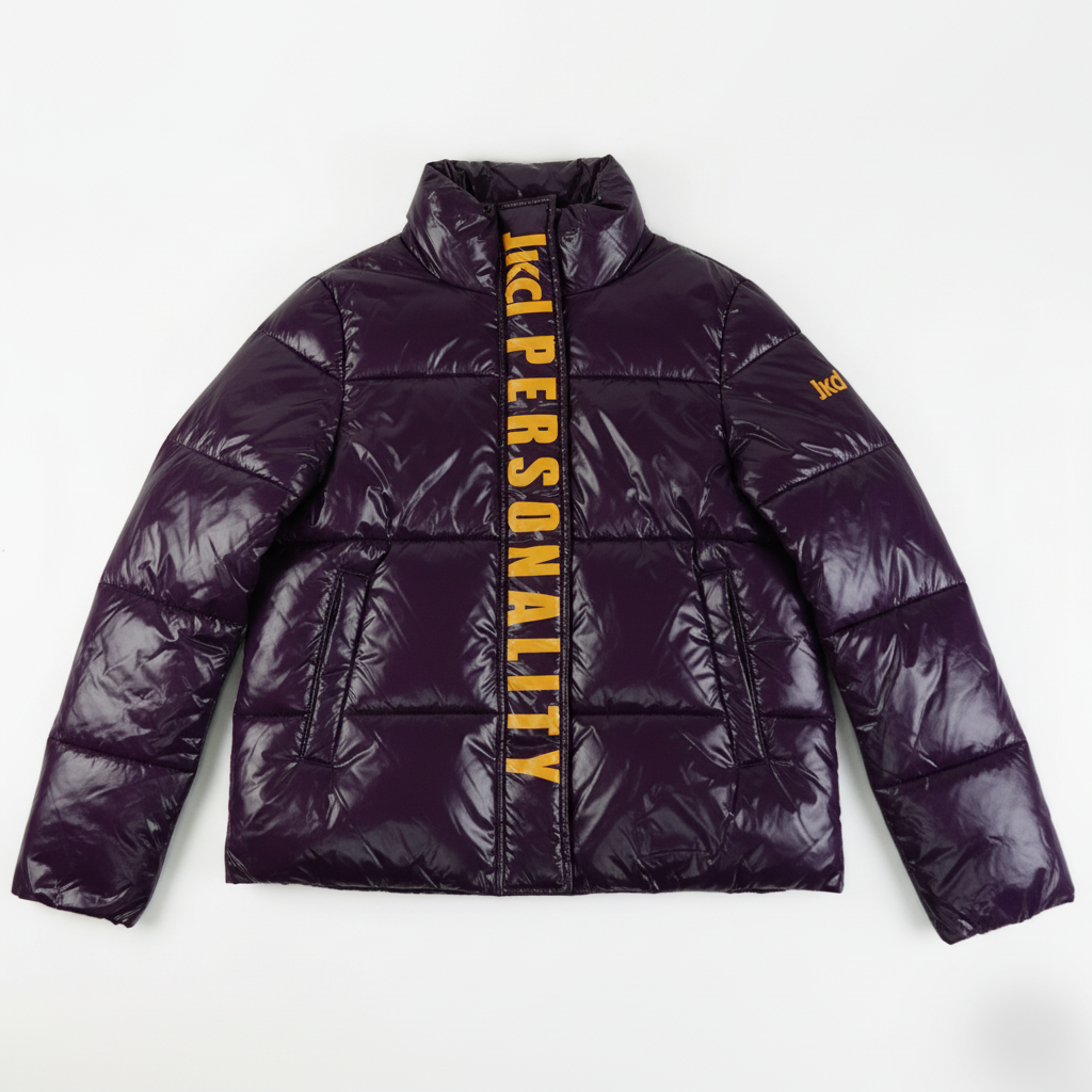 Piumino corto lucido colore viola con scritta verticale PERSONALITY a contrasto. Chiusura zip, collo alto e tasche laterali.