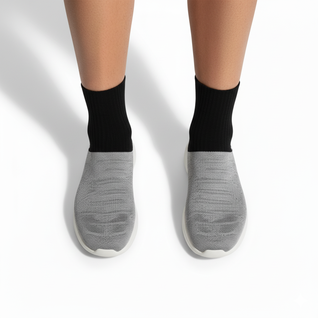 Sneaker tipo calza UYN con tomaia knit grigia e gambale nero a coste. Suola leggera e flessibile.