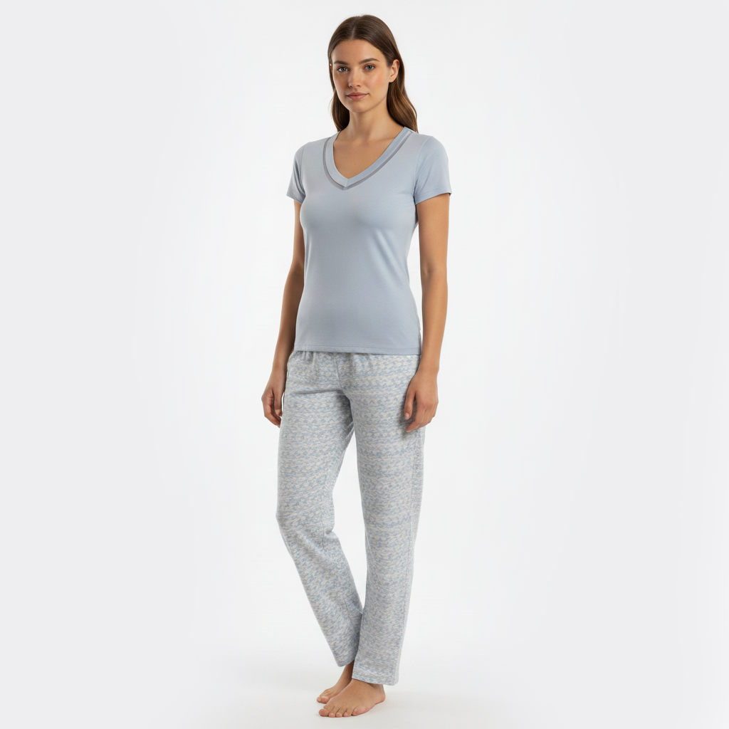 Maglia donna Emmevibi in tonalità celeste, con scollo a V rifinito da bordo elegante. Tessuto leggero, morbido e traspirante, perfetto per la stagione estiva e l’uso quotidiano.